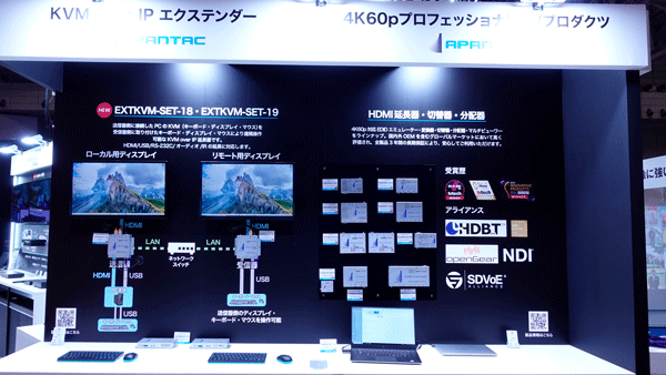 今回はの展示会では、送信器側に接続したPCのKVM(ディスプレイ・キーボード・マウス)を、受信器側に取り付けたディスプレイ・キーボード・マウスにより遠隔操作できるKVM over IP延長器を展示しました。