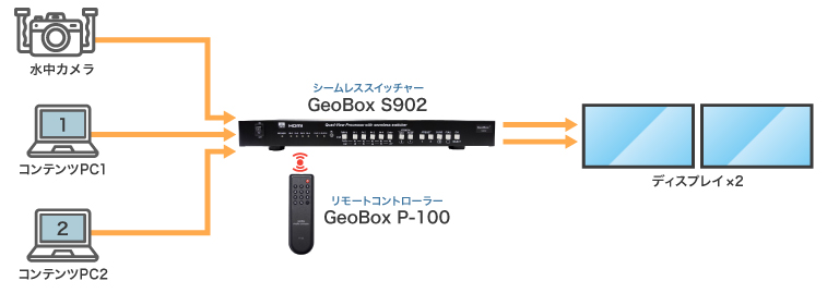 水中カメラおよび、コンテンツを保存したPC×2台からの映像データは、『S902』により1画面に合成されてディスプレイに表示されます。表示レイアウトを『S902』にプリセット登録しておくことで、リモートコントローラー『GeoBox P-100』のボタンにてシームレスに切り替えられます。