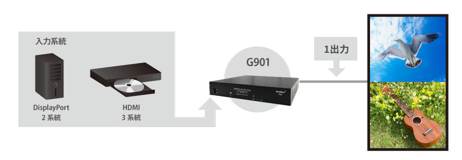 HDMI 3 系統とDisplayPort 2 系統から任意の2 系統の映像入力を左右または上下に分割し、1 台の表示機器に表示することができます。映像回転(ローテート)機能と併用してディスプレイを縦置きにした場合でも分割表示が可能です。音声出力は、メイン画面・サブ画面・ミュートから選択できます。
