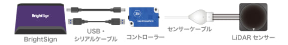 当製品は、LiDARセンサー、コントローラー、ケーブルがセットになったキット製品です。トリガー設定は「BrightSign」のオーサリングソフトウェア「BrightAuthor:connected」にて直感的な操作で行えます。コンテンツの再生ログは保存でき、ログデータをマーケティングにも活用できます。また、1つのコントローラーに最大8つのセンサーを接続でき、追加するセンサーはオプション品としてご購入可能です。