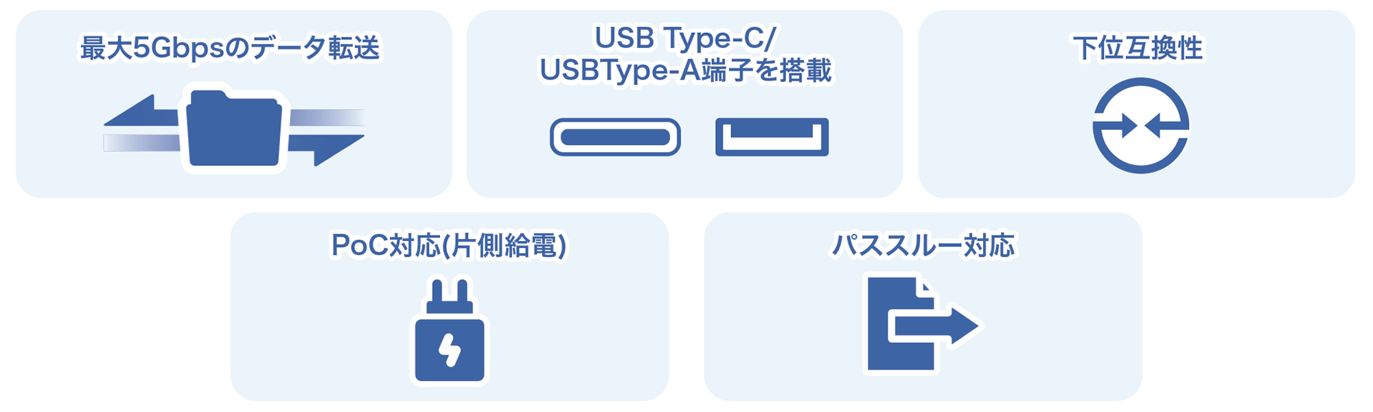 USB 3.2 Gen1を1本のLANケーブル(CAT6A)で最長100m延長でき、USB3.2データを最大5Gbpsで高速転送できます。受信器側にはUSB Type-C/Type-A端子をそれぞれ2系統装備しており、USB 2.0およびUSB 1.1との下位互換性を確保しています。RS-232Cおよびカメラ同期信号(FSYNC GPIO)のパススルーにも対応します。