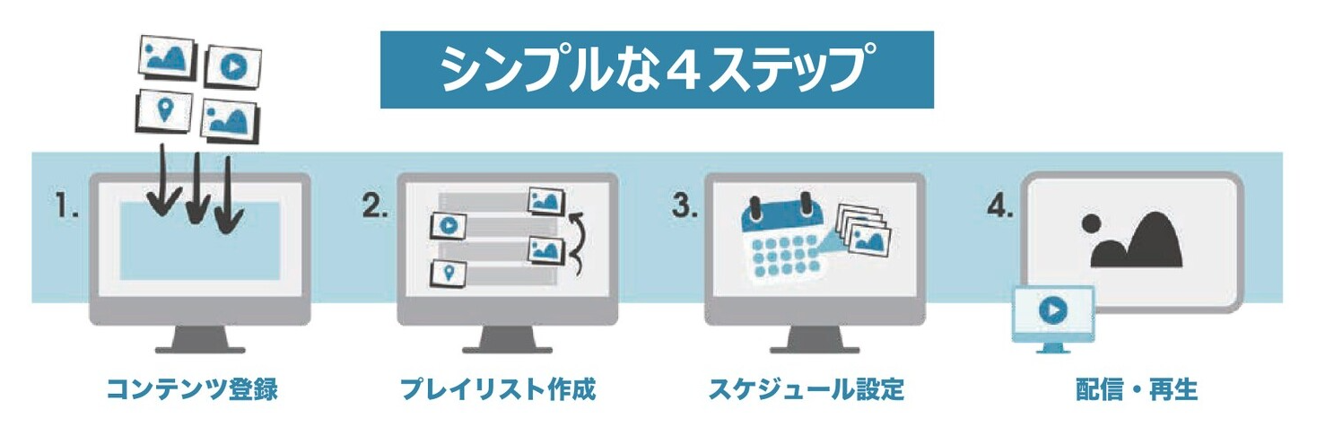 『NOWSIGNAGE』は、弊社取り扱いのサイネージプレーヤー「BrightSignシリーズ5」をはじめとする各種STB(セット・トップ・ボックス)に対応したクラウドベースのデジタルサイネージ用CMSです。①コンテンツの登録、②プレイリストの作成、③スケジュール設定、④配信・再生の4つのステップで簡単にデジタルサイネージを実現できます。