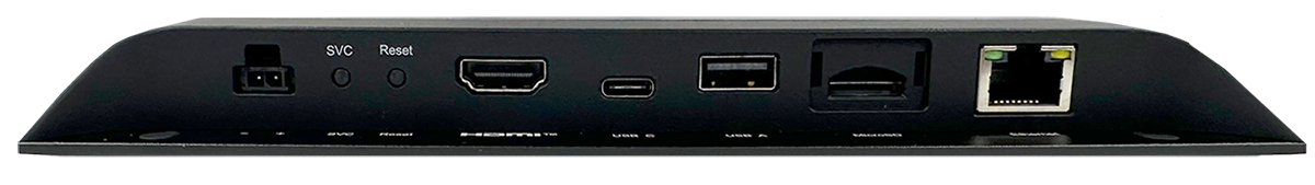 ・HDMI出力(2.0a)端子 ・Micro カードSDスロット ・イーサーネット端子 ・SVC、Resetボタン ・電源入力コネクタ |