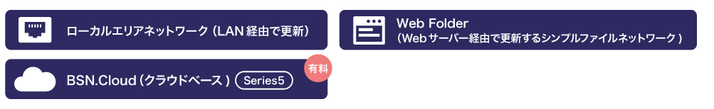 BrightSignシリーズ5は、無料で利用できるネットワークサービスである「ローカルネットワーク」および「Web Folder(シンプルファイルネットワーク)」と、有料のクラウド型「BSN.Cloud」の3つのネットワークソリューションに対応しています。「BSN.Cloud」により安価で簡単なプレーヤー管理が可能になります。