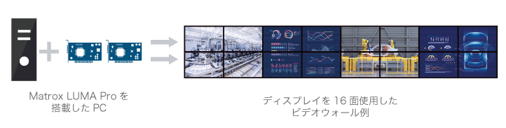 1枚で最大4K x 8出力が可能なグラフィックボード『Matrox LUMA Proシリーズ』など、マルチディスプレイ対応グラフィックボードを使用することで、工場内や監視室などに最適な高画質・大画面ビデオウォールを構築し、業務の効率化を図ることが可能です。