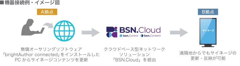 サイネージプレーヤー『BrightSign』は、3つのネットワーク更新に対応しており、離れた場所からコンテンツや配信スケジュールを更新できます。作成したコンテンツをPCから自社のWebサーバーへアップロードし、Webサーバーからプレーヤーがダウンロードして再生するプルダウン方式の「シンプルファイルネットワーク」、コンテンツをPCからLAN経由でプレーヤーに転送し再生するプッシュ方式の「ローカルエリアネットワーク」のほか、クラウドサービス『BSN.Cloud』を利用する方法があります。インターネット接続環境さえあれば、専用のオーサリングソフトウェア「brightAuthor connected」で専門知識がなくても簡単にサイネージをリモート管理できます。