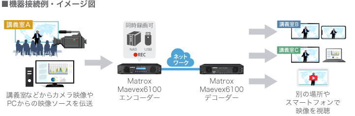 4K対応HDMIエンコーダー・デコーダー『Matrox Maevex 6100』またはFHD対応HDMIエンコーダー『Matrox Maevex 5100』を導入することで、複数拠点への動画配信が可能です。校内イベントや社内イベント、またセキュリティ用カメラなどの映像をストリーミング配信し、複数の場所で視聴・録画できます。エンコーダーにカメラやPC・メディアプレイヤーなどのソース機器(動画を再生)を接続し、映像を同一ネットワークまたはWeb経由で配信。リアルタイムで各拠点にて同じ映像を視聴できます。映像の視聴は、専用のデコーダーでディスプレイに表示したり、同一ネットワーク上のPCからVLCプレイヤーで再生したり、YouTubeライブなどのWebサービスを利用してスマホやタブレットで再生できます。
